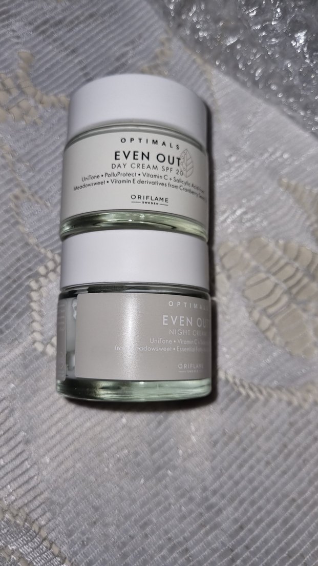 Oriflame Optimals Even Out gündüz kremi SPF 20 koruma ve gece kremi ile cilt tonunu eşitler, Vitamin E ve doğal özler içerir.