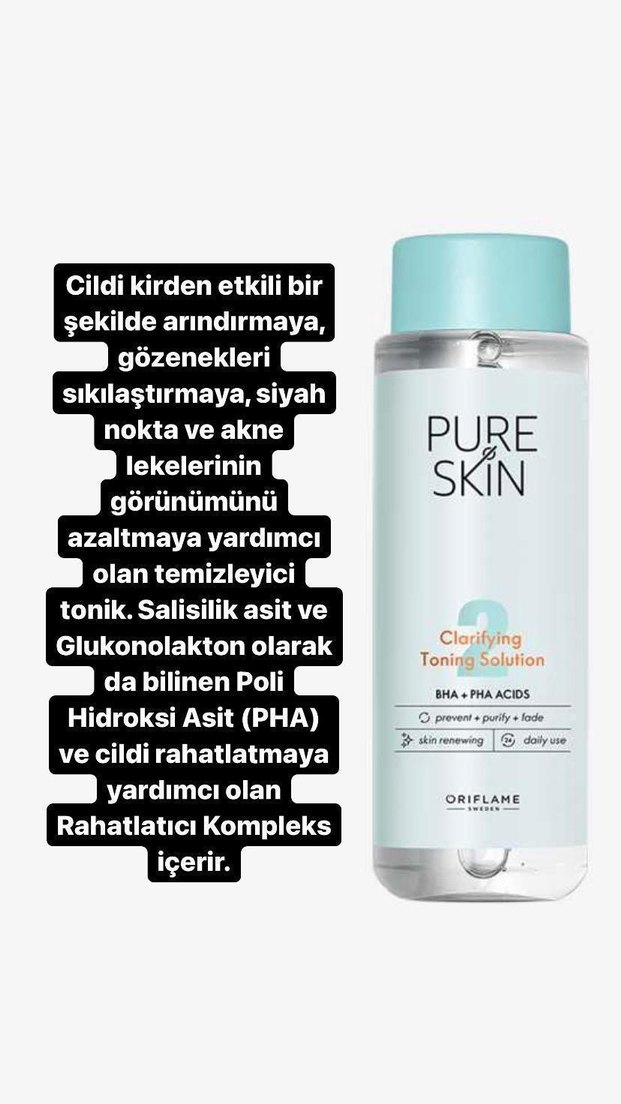 Oriflame Pure Skin tonik, cildi kirden arındırır, gözenekleri sıkılaştırır, siyah nokta ve akne lekelerini azaltmaya yardımcı olur. Salisilik asit, Glukonolakton ve rahatlatıcı kompleks içerir.