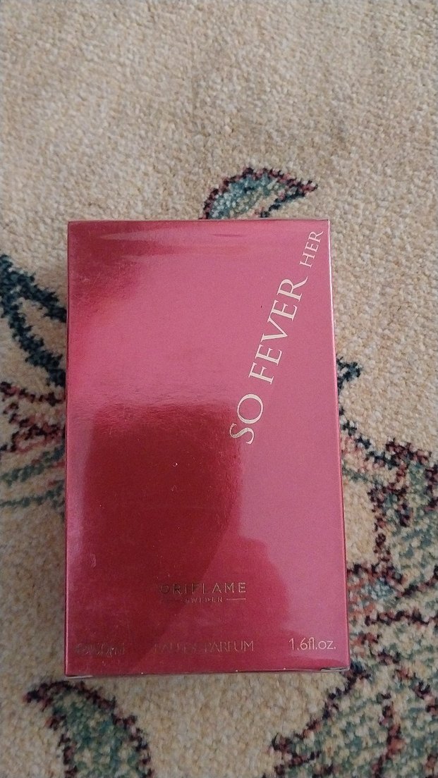 Oriflame So Fever Her kadın parfümü, 1.6 fl oz (50 ml) şişede, zengin ve şık kokusuyla sunulur. Parlak kırmızı kutuda, hediye için uygundur.