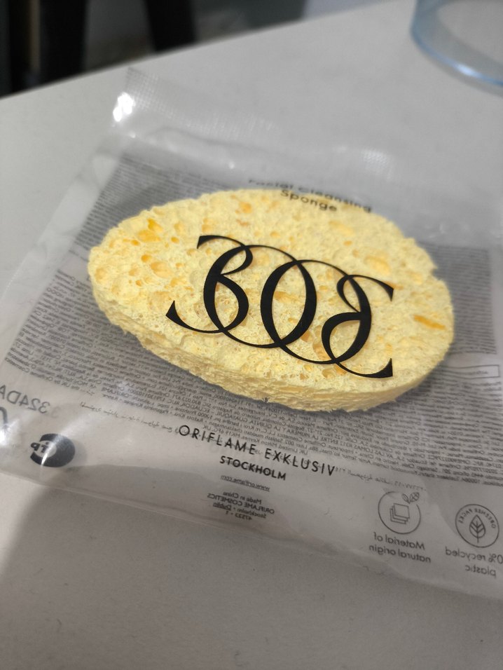 Oriflame Stockholm makyaj süngeri, altın renginde, pürüzsüz ve eşit uygulama için yumuşak dokulu.