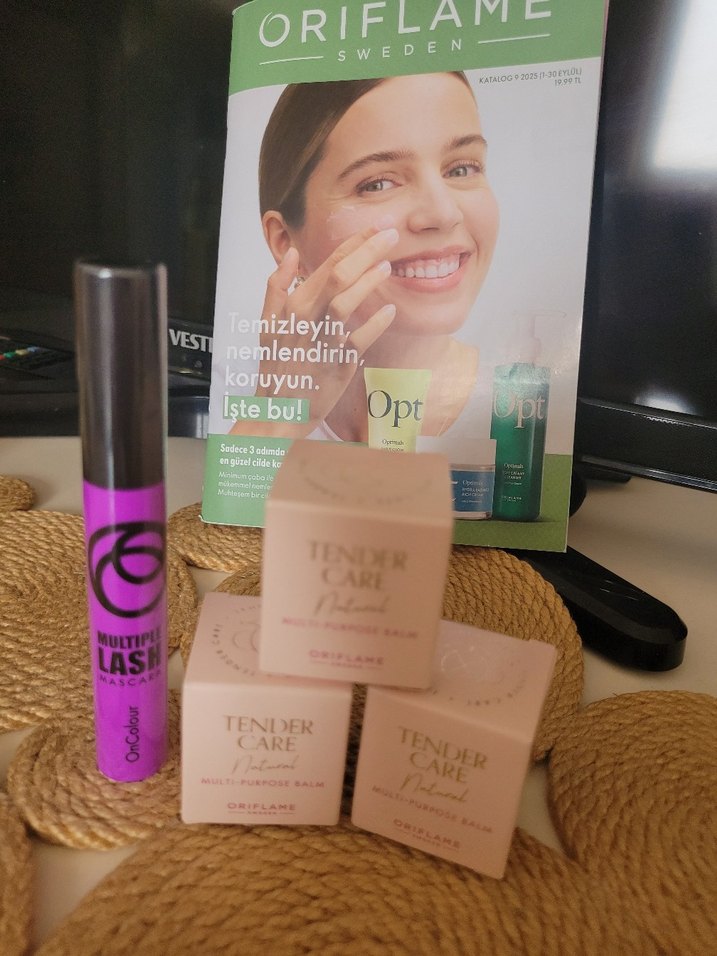 Oriflame Tender Care Doğal Bakım Balmı, küçük kutularda nazik cilt bakımı sunar. Set içinde mor Oriflame maskara ile kirpikler belirginleşir.