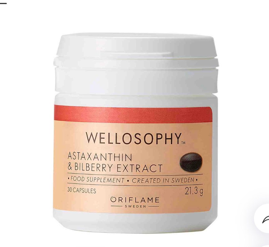 Oriflame Wellosophy markalı, astaksantin ve yaban mersini özü içeren 30 kapsüllük besin takviyesi. Toplam ağırlık 21.3g.