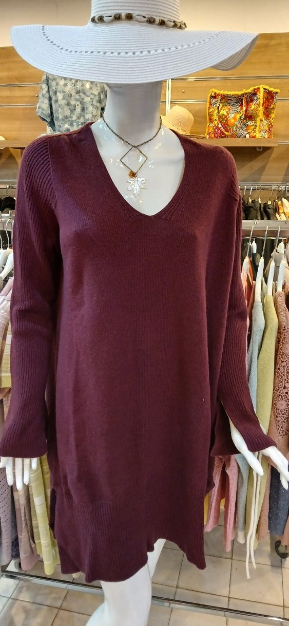 Bordo renkli, V yakalı ve uzun kollu örgü kazak, midi boyda ve bol kesimdir, rahat ve şık bir görünüm sunar. Kaşmir, pamuk