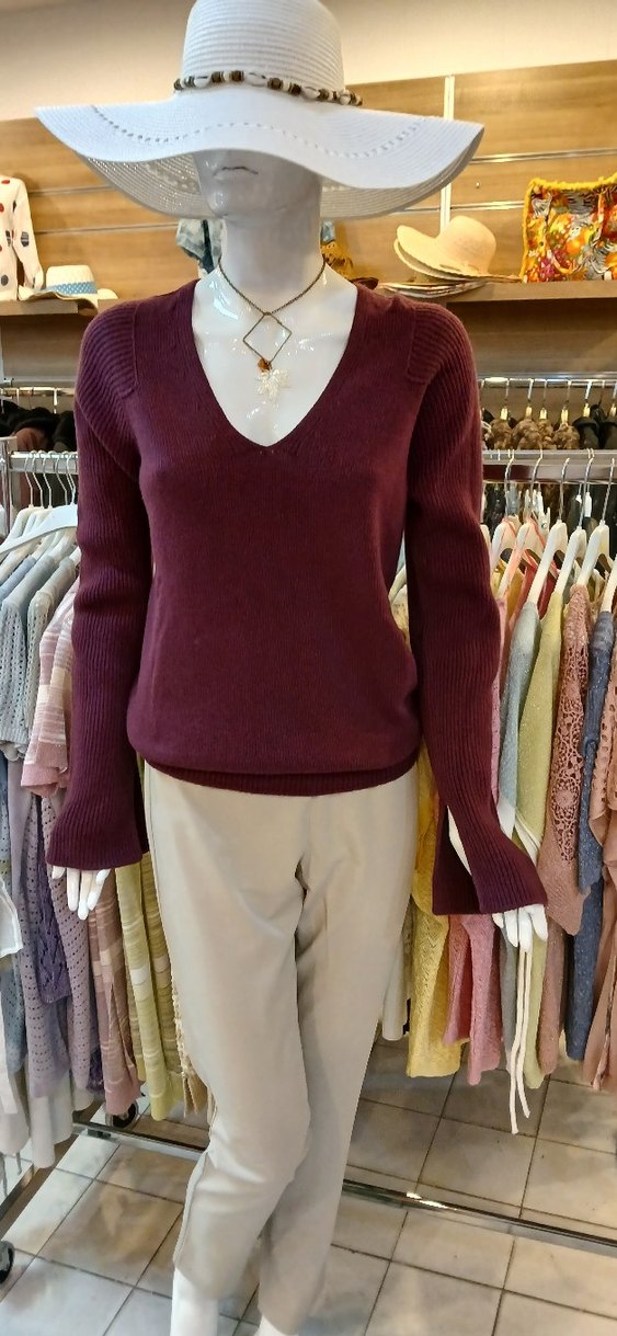 Bordo renkli, V yakalı ve uzun kollu, bol kesim örgü kadın kazak. Günlük kullanıma uygun, midi boy rahat ve şık bir parça. Kaşmir,pamuk.