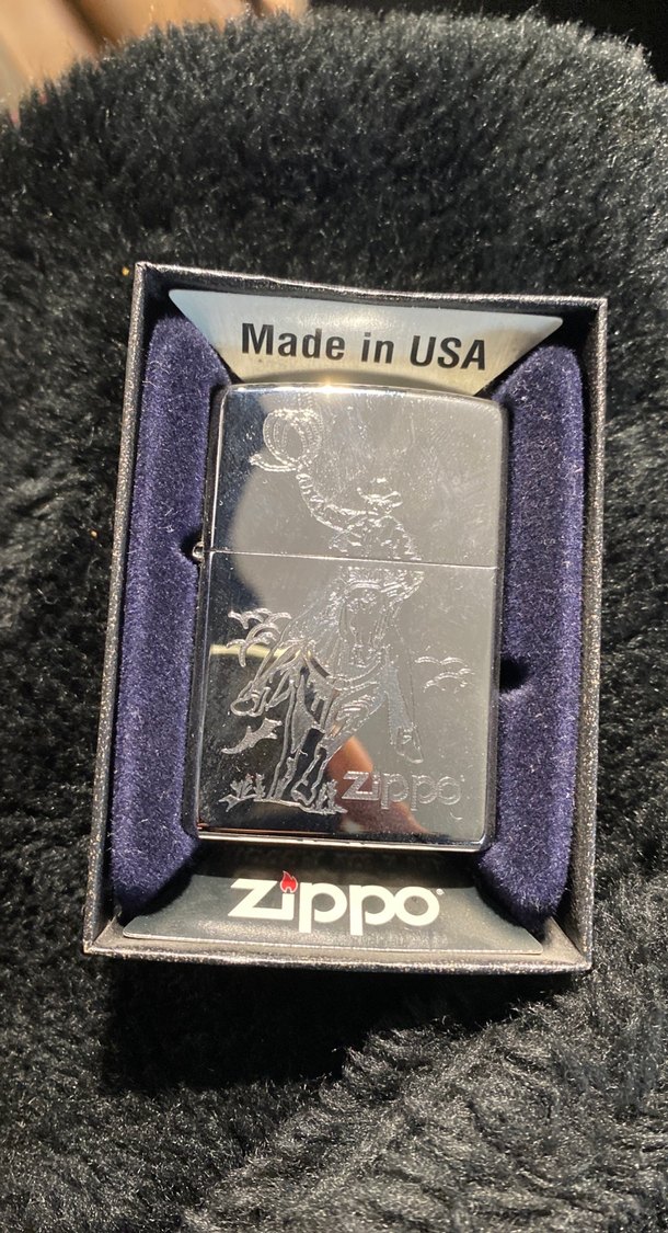 ABD yapımı, altın renkli ve bisikletçi desenli vintage Zippo çakmak. Klasik biker tarzını yansıtır. ️