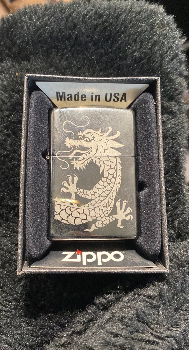 Gri renkte ejderha desenli vintage tarzda Zippo çakmak, ABD yapımı ve orijinal kutusunda.
