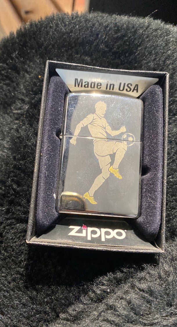 ABD yapımı, orijinal kutusunda, futbolcu figürlü koyu altın renk Zippo çakmak. ⚽