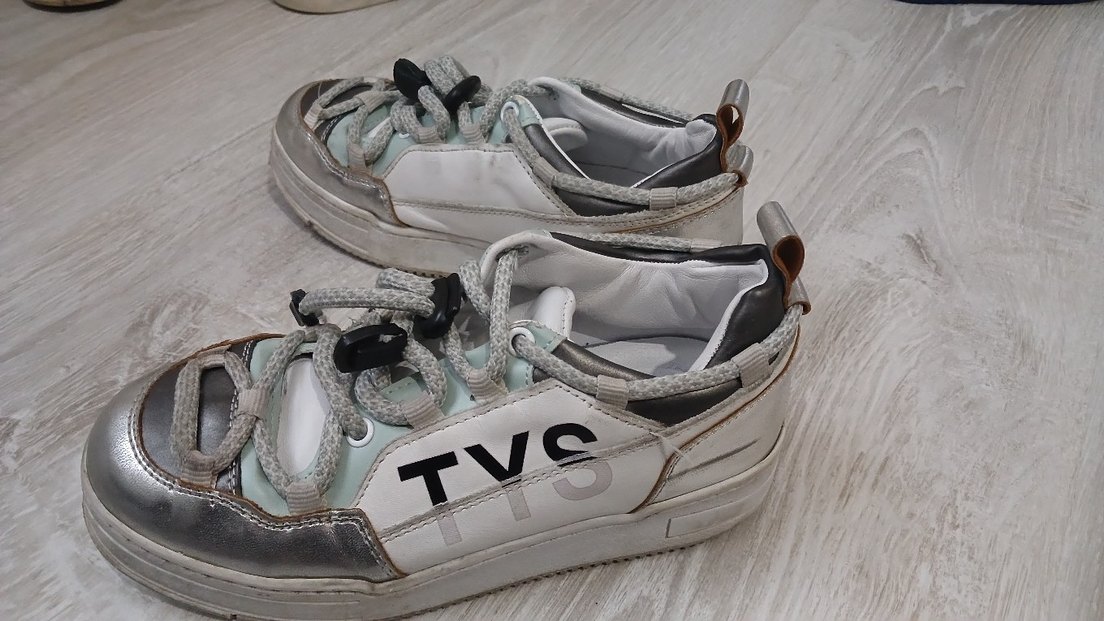 Baskılı detaylara ve stiletto topuklu beyaz kadın spor ayakkabısı. Velcro kapama ve kauçuk taban, TVS markalı. Sokak stili için uygun.