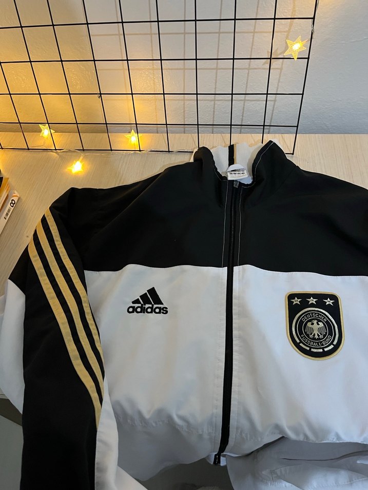 Beyaz ve siyah renklerde, baskılı ve Adidas logolu, yumuşak ve sıcak dokulu, yapışkan bantlı, dar kesim erkek çocuk ceketi.