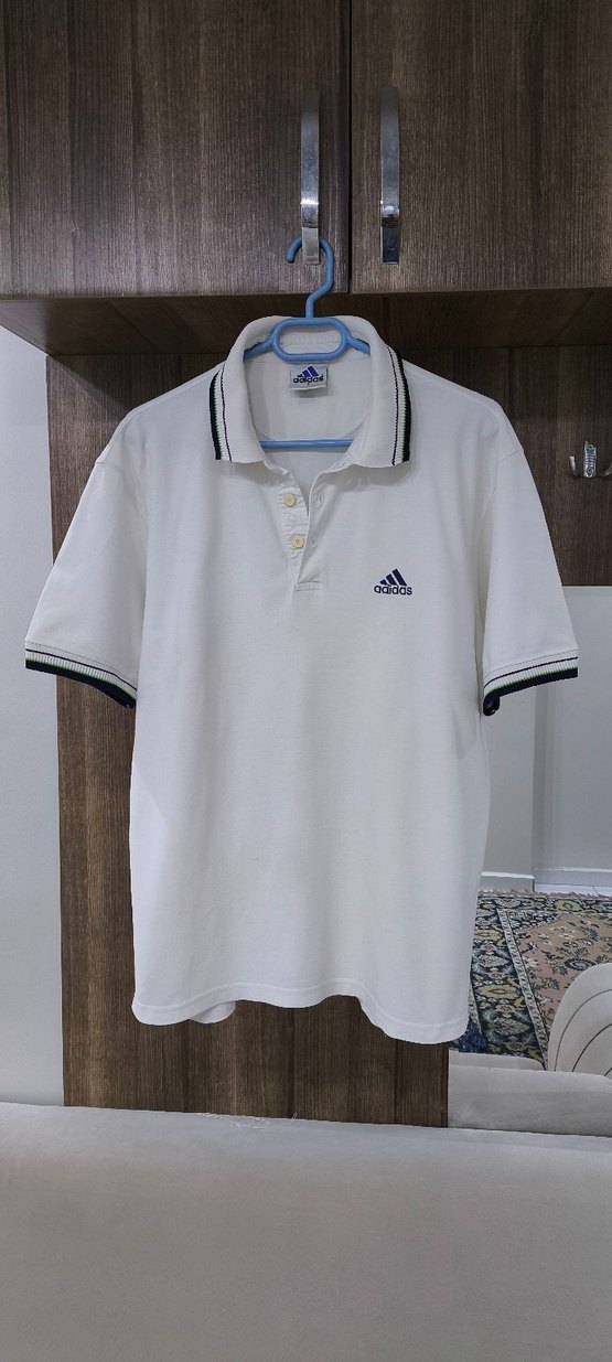 Az kullanılmış, temiz ve defosuzdur. Eni 57 cm, boyu 73 cm. %100 pamuklu, yumuşak ve nefes alabilen pike kumaşıyla yaz aylarında konforlu bir yapıya sahiptir. Beyaz rengin sadeliği, yaka ve kol uçlarındaki klasik Adidas çizgili (lacivert-yeşil) detaylarla hareketlendirilmiştir. Göğüs kısmındaki lacivert logo nakışı markanın kalitesini vurgular. Kaliteli dikişleri ve dayanıklı kumaşıyla uzun süreli kullanımlarda formunu korur. Geniş ve rahat kalıbıyla hem spor hem de casual kombinlerde rahatlıkla tercih edilebilir. Dolabımda beden uyumunuza göre gömlek, tişört, pantolon ve kazaklar da mevcut. Toplu alımda indirim yapılır.