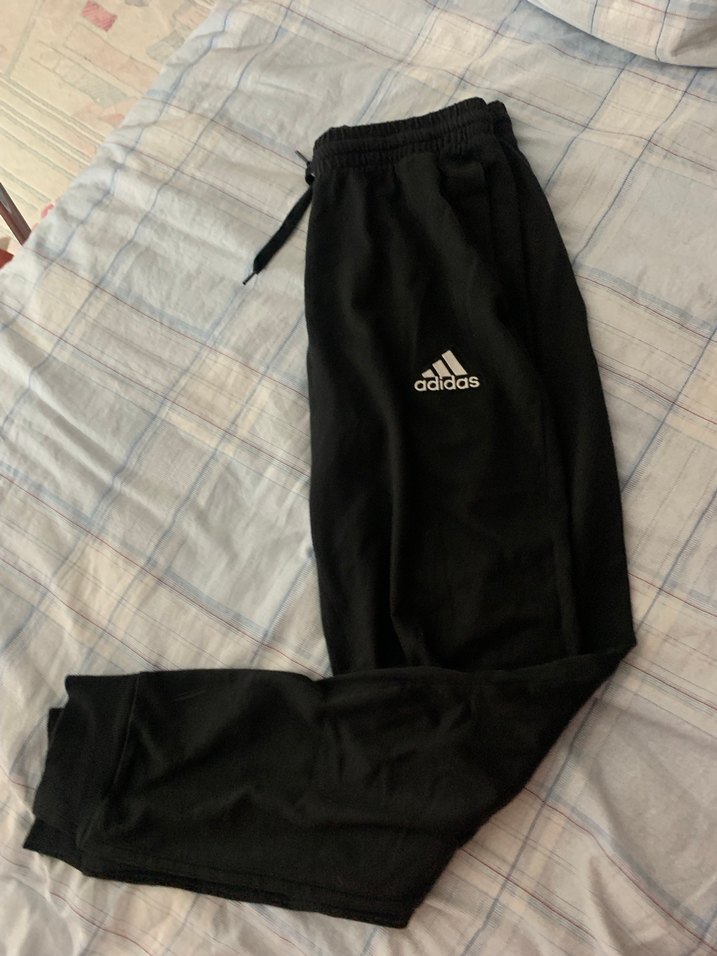 Erkekler için siyah Adidas eşofman altı, bol kesim ve yumuşak kumaştan. Fermuarlı cepleri ve elastik beli vardır. Rahat sokak stili için uygundur. S beden kadınlar da oldukça rahat kullanabilir