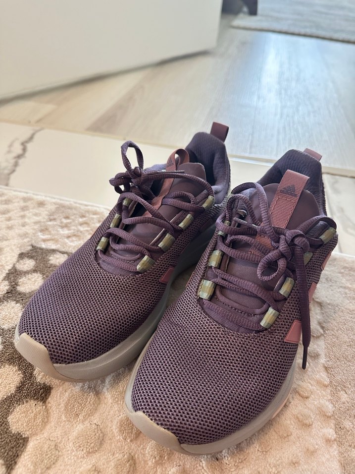 Mor bağcıklı, yüksek topuklu ve gri kauçuk tabanlı kadın spor ayakkabısı. Sokak stili ve günlük kullanım için uygun, rahat ve trend. Ürünü açık alanda hiç kullanmadım spor yaparken spor salonunda kullandım sadece çok rahat bir ayakkabı orijinaldir