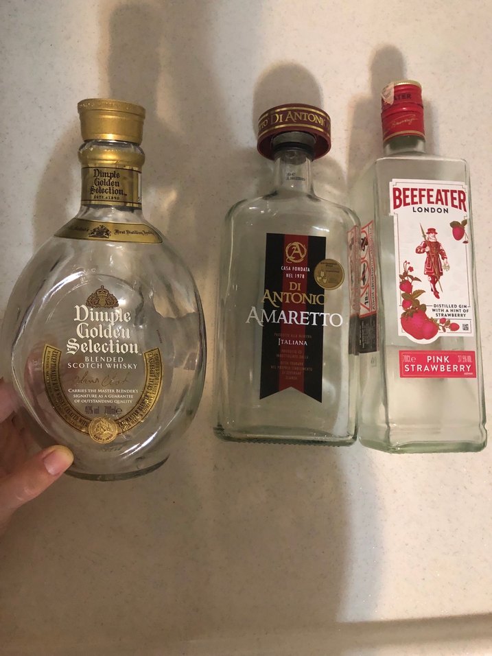 Set içinde Dimple Golden Selection viski, Di Antonio Amaretto likörü ve Beefeater Pink Strawberry cin şişeleri bulunur.