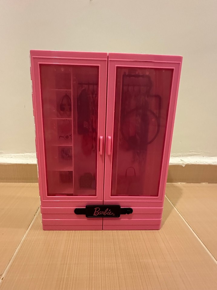 Canlı pembe renkli Barbie çocuk dolabı, iki kapılı ve kompakt tasarıma sahip. Kırık değildir.