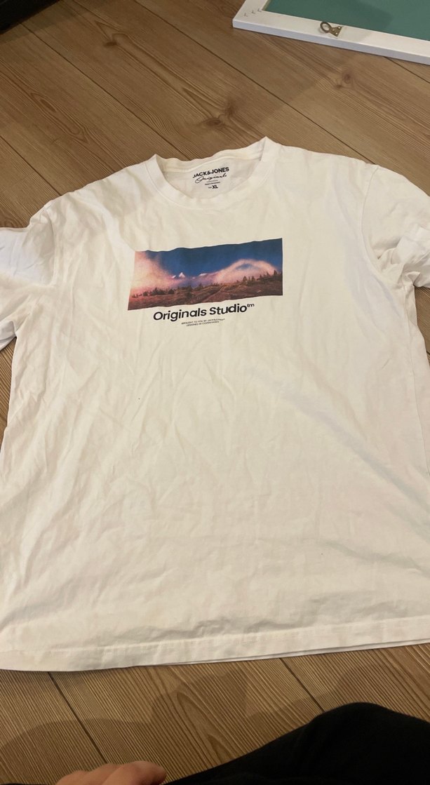 Bu beyaz erkek tişörtü, rahat kesim, kısa kollu ve bisiklet yaka özelliklerine sahiptir. Yumuşak pamuktan üretilmiş olup, önünde pastel renkli manzara ve 'Originals Studio' baskısı bulunur.