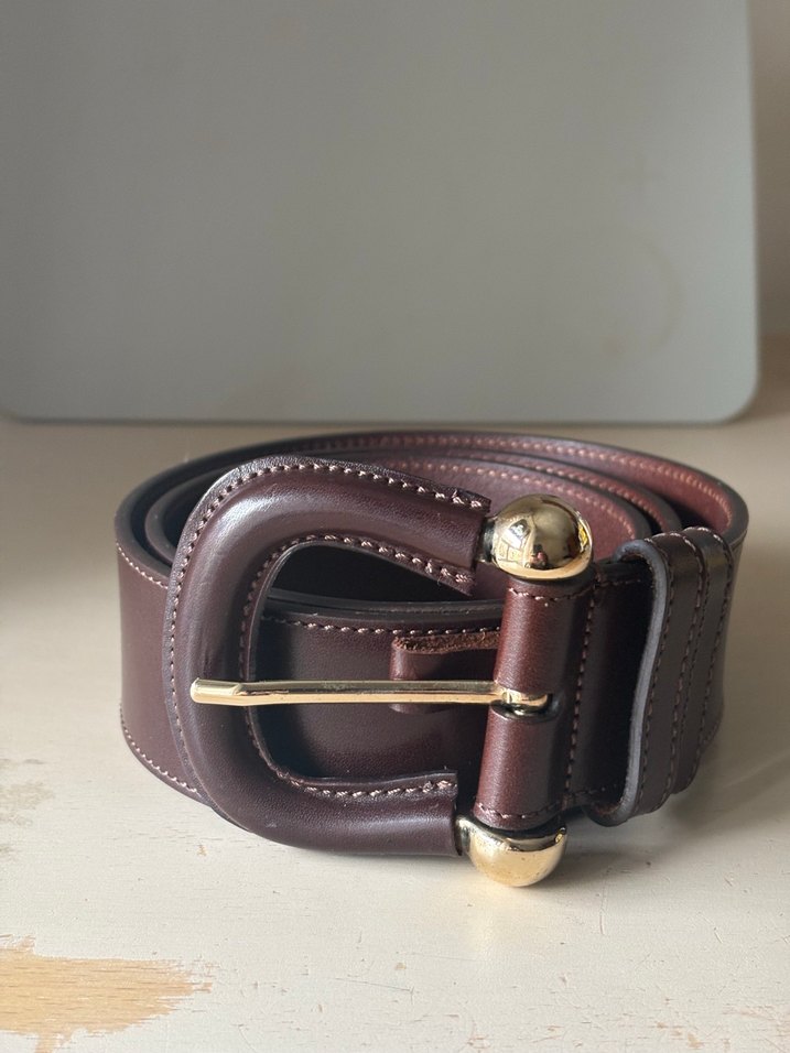 Koyu kahverengi deriden yapılmış, tokalı klasik ve geleneksel tarzda kadın kemeri 110 uzunluk 5 cm genislik . Altın detaylı sağlam tokası bulunur. Sonradan delik eklenmistir