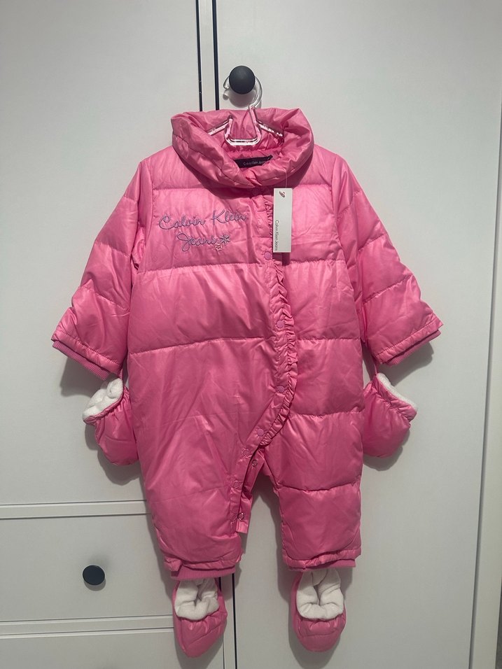 1 yaş (80 cm) etiketli sıfır ayakları ve eldivenleri çıkıp takılabiliyor. Fermuarlı, yakalı ve pastel pembe renkte kız bebek tulumu, sıcak tutar ve rahattır. ❄️