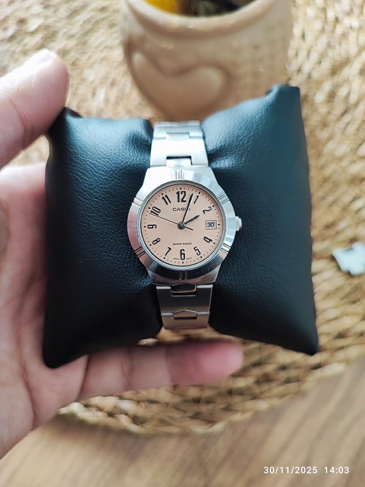 Az kullanılmış tertemiz orijinal Casio kadın saati. kutusu yok. pil durumu yenidir. Kalın bilekler için ek bir yedek parçası var. gönül rahatlığıyla alabilirsiniz. Cinsiyet = Kadın,Makine Tip = Analog,Kasa Şekil = Oval,Kasa Renk = Gri,Kadran Renk = Taş pembesi ,Kayış Kordon Tip = Çelik, Cam Tip = Mineral, Takvim = Var, Kasa Kalınlık = 8,6, Kasa Çap = 25,Ağırlık = 51,Kasa Yükseklik = 33