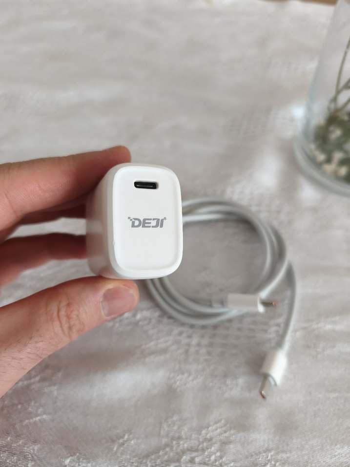 DEJI beyaz telefon şarj adaptörü, USB-C kablo ile hızlı şarj sağlar. Kompakt ve hafif yapısıyla kolay taşınabilir. ⚡