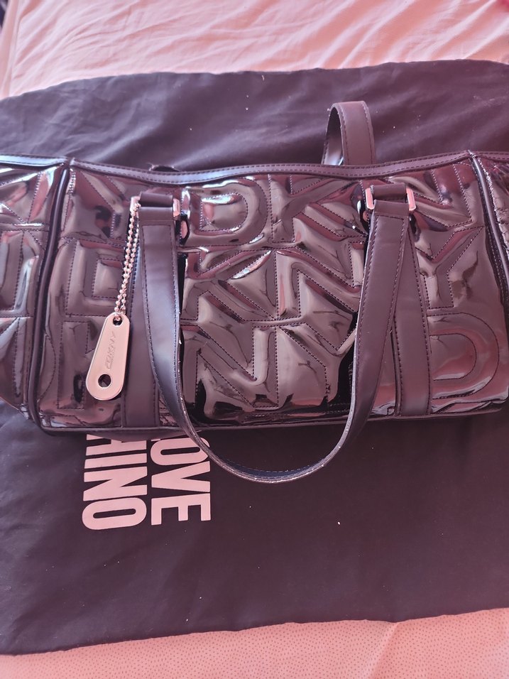 DKNY kabartmalı, siyah suni deri çanta. çantanın yanlarında suni deri olması dolayısıyla yipranmalar vardır. saplarda mumları çıktığı için iplikler çıkmıştır, kullanımda rahatsızlık vermez. lostrada kolayca halledilebilir. çantanın altında ve içinde hiçbir sorun yoktur.
