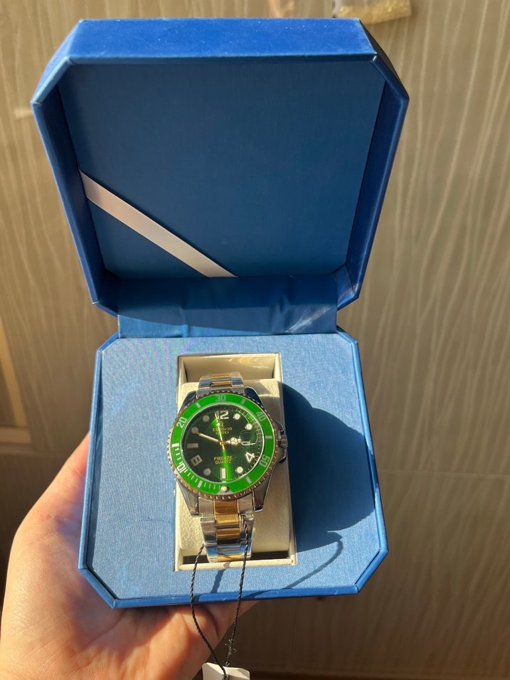 koyu yeşil kadranlı erkek kol saati, metal kayışlı ve mavi kutuda sunuluyor. Temiz ve modern görünüm.