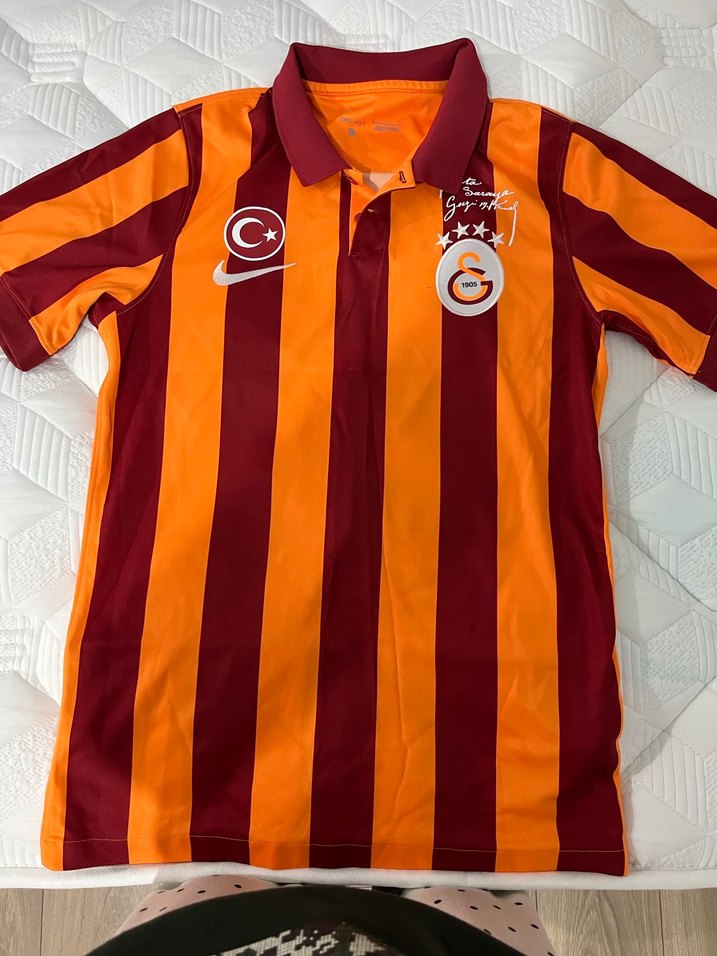 Kısa kollu, düğmeli ve yakalı, vücuda oturan erkek forma. Parlak kahverengi ve turuncu çizgili baskıya sahip, günlük kullanım için uygun. ⚽