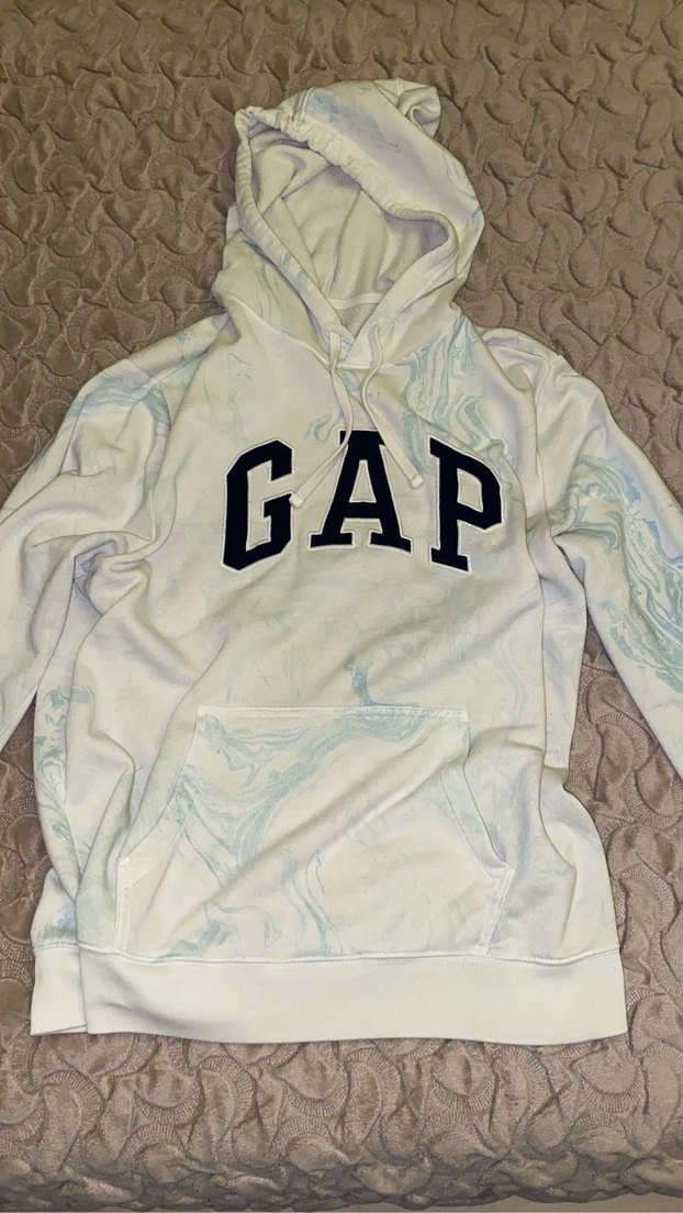 GAP markalı, beyaz üstüne mavi desenleri olan kapüşonlu, uzun kollu sweatshirt.Nerdeyse hiç. kullanılmamış,defosuz L beden ama M giyen birisine de olabilir.
