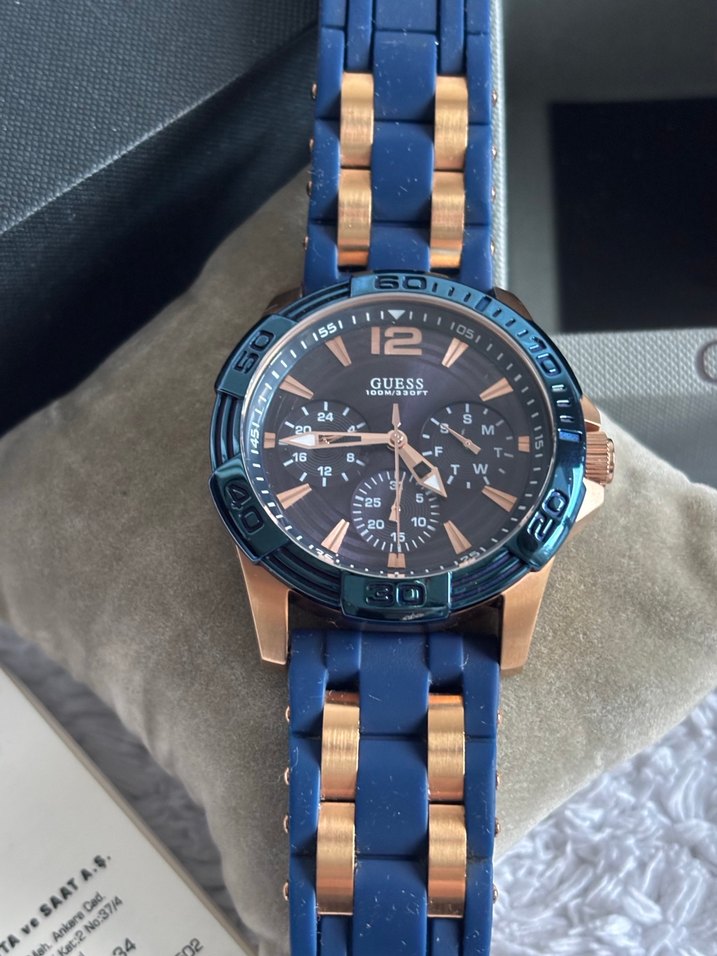ORİJİNAL GUESS GUW0366G4 ROSE GOLD KASA LACİVERT SİLİKON KORDON KASA ÇAPI 43MM KUTUSUNDADIR. GARANTİ BELGESİ MEVCUT FAKAT GARANTİ SÜRESİ BİTMİŞTİR. 100 METRE SU GEÇİRMEZ ÖZELLİĞİ MEVCUT OLDUKÇA TEMİZ KORDON KUSURSUZ SADECE 6 YÖNÜN DE ÇOK UFAK BİR ZEDELENME VARDIR RESİMLERDE MEVCUTTUR CAMI TERTEMİZDİR BAŞKA HİÇBİR KUSURU YOKTUR TERTEMİZDİR.