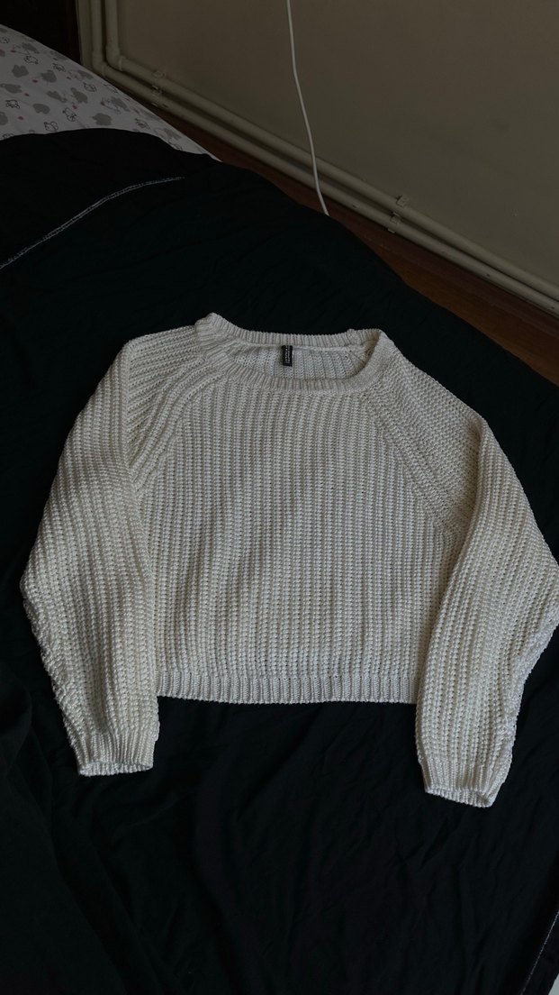 Orijinal hm bej krem kazak. Temiz ve sorunsuzdur. Sadece 1 kere yıkanmıştır kullanılmamıştır.Beyaz renkli, örgü kumaştan uzun kollu, yuvarlak yaka, bol kesim ve normal midi uzunlukta kadın kazak.