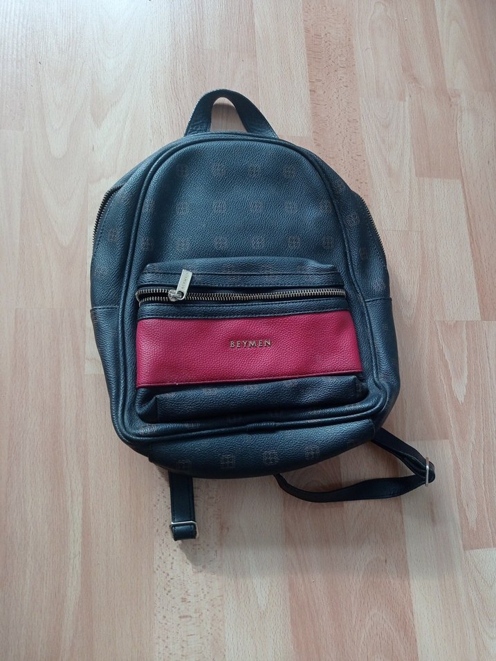 Kilitli bantlara sahip siyah deri sırt çantası, baskılı desenli ve önünde kırmızı cepli, "BEyMEN" yazılı. Günlük sokak stili için uygun.