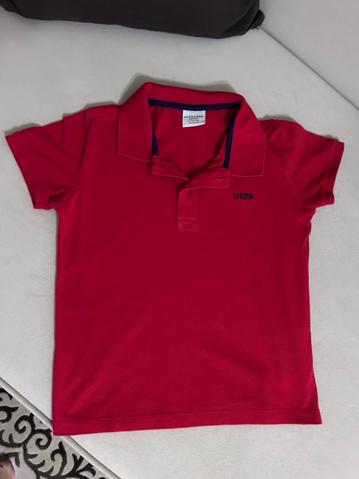 Dar kesim, kısa kollu, yakalı kırmızı erkek çocuk polo tişört. USPA logosu ile sade ve rahat, yumuşak ve sıcak kumaştan üretilmiştir. Bir kez giyilmiştir