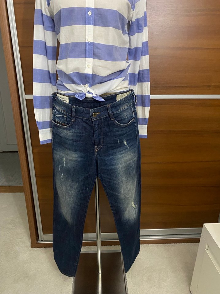 Lacivert ve gri çizgili, bol kesim, kemerli kadın kot pantolon. Denim kumaştan, normal midi boyda ve günlük kullanıma uygun normcore tarzda.