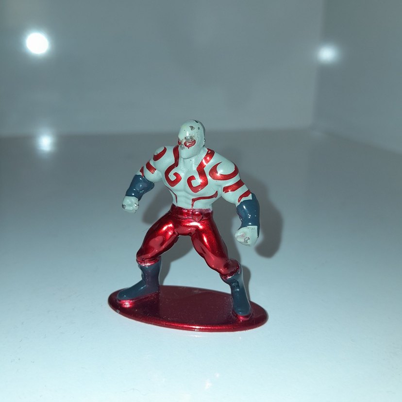 Siyah taban üzerinde duran, kırmızı ceketli ve koyu pantolonlu, silah tutan mini aksiyon figürüdür. Sarı saç detayı ve hareketli pozda. ️