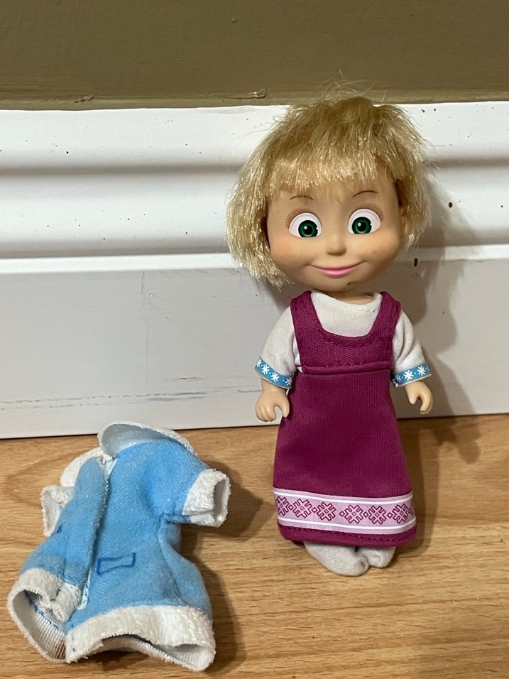 Bu pastel renkli bebek beyaz gömlek ve desenli mor elbiseye sahiptir. Yumuşak mavi bir ceketi vardır. Çocuklar için sevimli bir oyuncak.