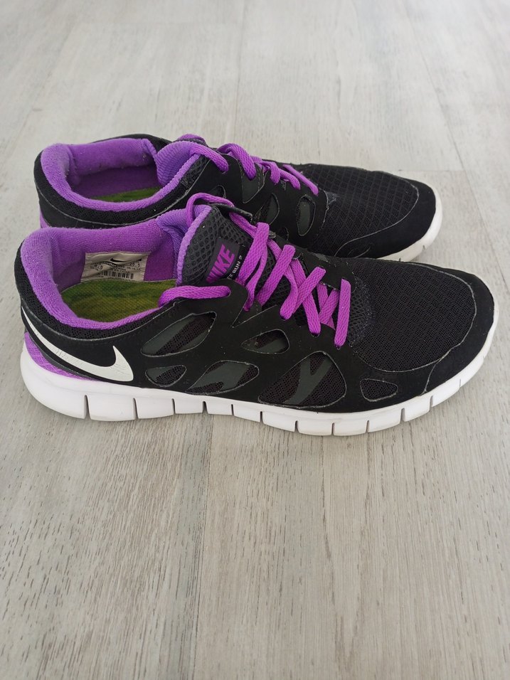 Mor ve siyah renklerde baskılı desenli, cırt cırt detaylı kadın spor ayakkabısı. İnce topuklu ve kauçuk tabanlı, şık sokak stili için uygun.