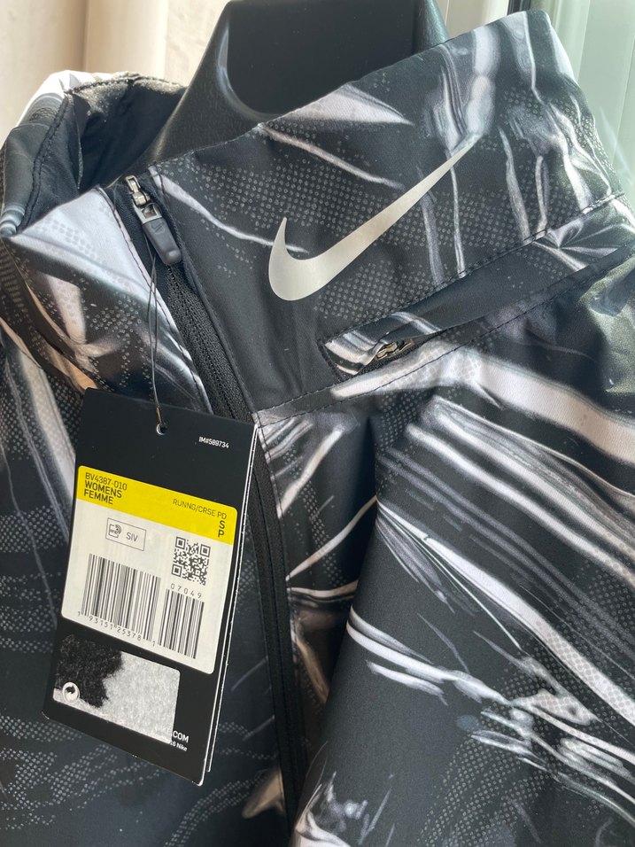 Nike marka siyah beyaz renkte hava alabilen kumaş ve hafif sporda giyilebilecek rüzgarlık.