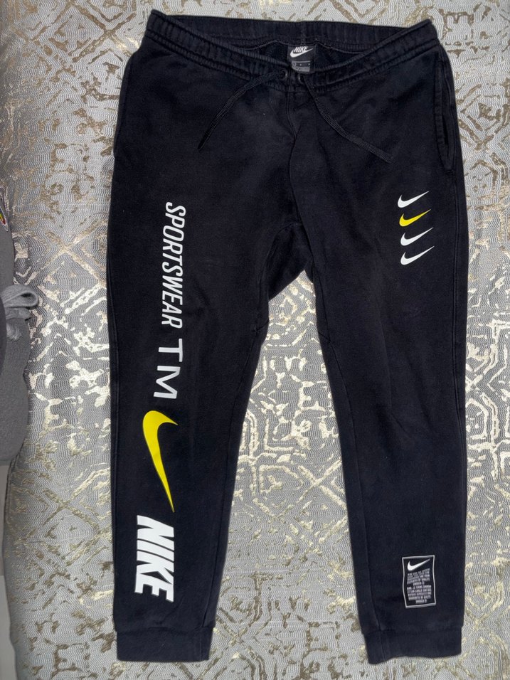 Nike siyah, cepleri ve baskılı logoları olan, bağcıklı, sentetik kumaştan yapılmış, normal boy erkek eşofman altı. Spor ve günlük kullanım için uygundur. ♂️