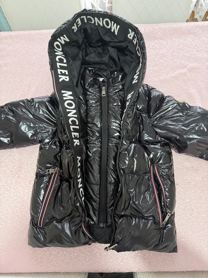 5/6 yaş unisex çocuklar için siyah, parlak, fit kesim mont. Fermuarlı ön ve Moncler yazılı kapüşonlu yakaya sahip. Sokak modası stilinde, dolgulu ve sıcak tutar.