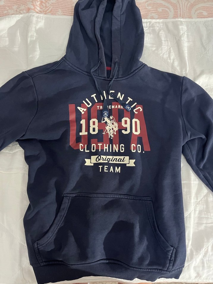 Koyu mavi, kapüşonlu ve uzun kollu, baskılı erkek sweatshirt. Yumuşak ve örme dokulu fleece kumaştan, günlük kullanıma uygun.Hiç giyilmedi.