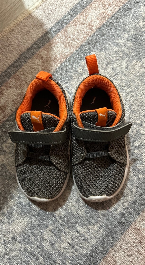 Gri yılan desenli erkek çocuk spor ayakkabısı, kolay kapanan cırt cırtlı bantlıdır. Kauçuk tabanı dayanıklıdır, turuncu iç kısmı dikkat çeker. 13cm.
