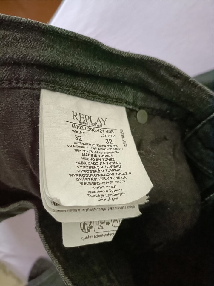Replay marka, 32 beden siyah kot. Etikette üretim ve bakım bilgileri yer alıyor. Kalitesini bilen bilir. En : 42-43 Boy : 101-102 Paça : 15-16