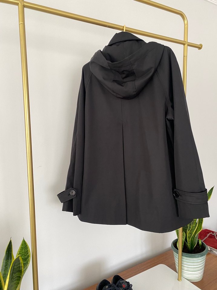 Siyah midi boy, salaş kesim yağmurluk, uzun kollu ve kapüşonlu. Sentetik kumaştan yapılmıştır, günlük kullanım için uygundur. ️