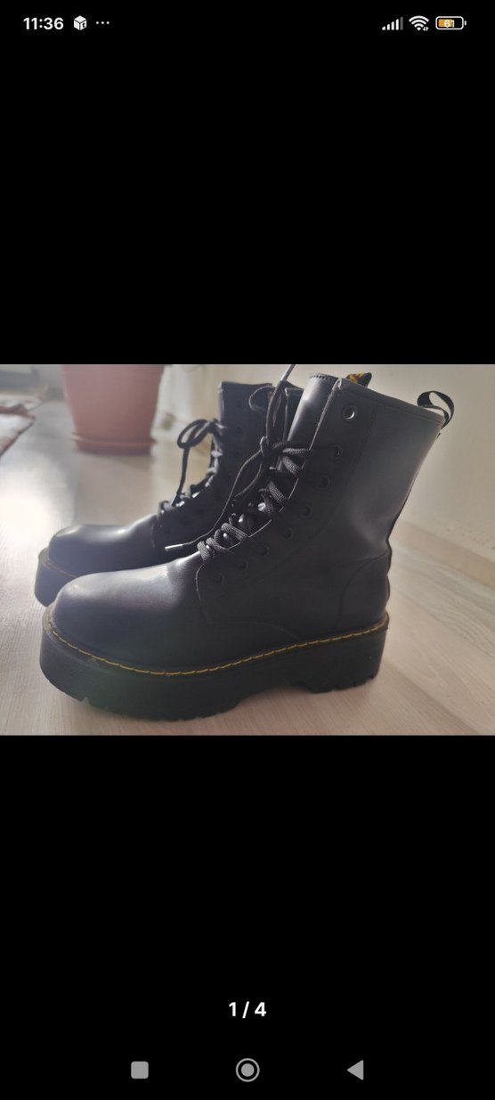 Siyah platform topuklu, tokalı gotik kadın botları. Kauçuk malzemeden yapılmış, desen içermeyen bu botlar günlük kullanım için rock punk havası sunar.