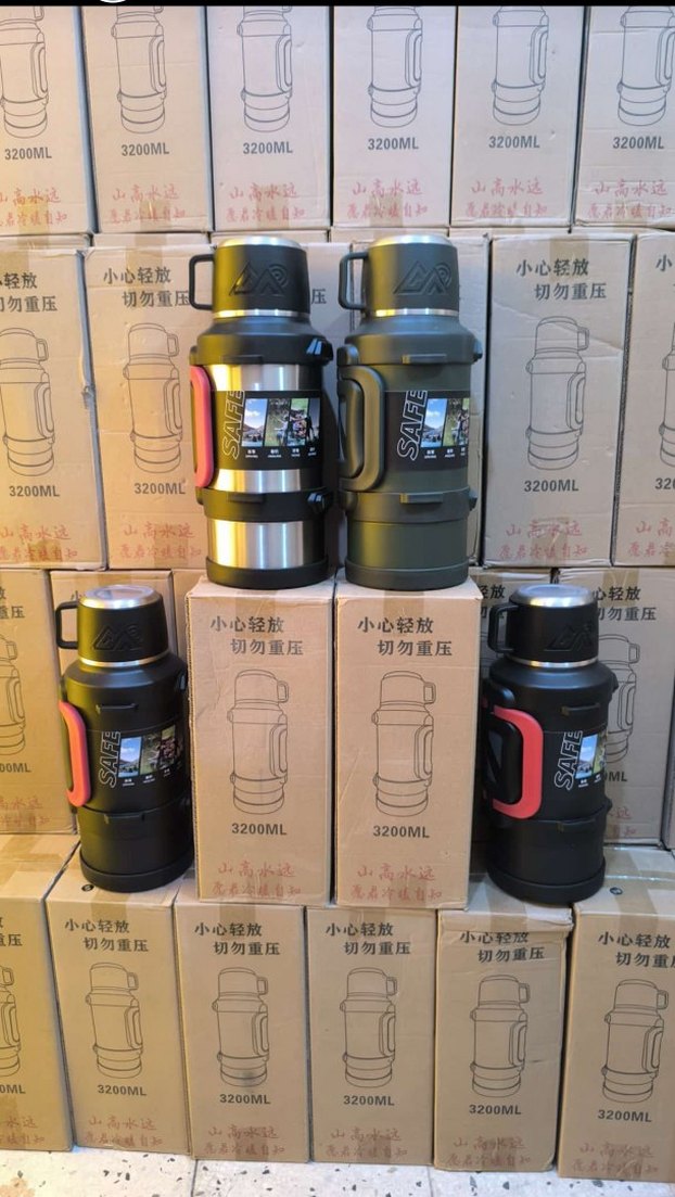 Renkli ve haki renkte 3200ml kapasiteli çocuk termos şişesi, dayanıklı kulp ve güvenli kapağa sahiptir.