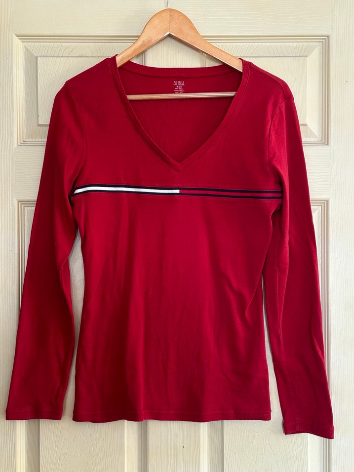 Orijinal Tommy Hilfiger uzun kollu üst kırmızı önden şeritli V yaka M beden az kullanıldı iyi durumda ürünlerimde iade yoktur.