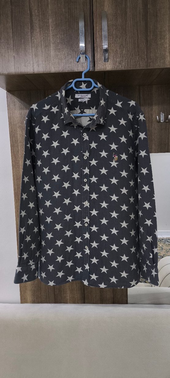 Kalın kumaşlı, az kullanılmış, tertemiz ve defosuz. Eni 61 cm, boyu 76 cm. Slim Fit. Koyu gri zeminde beyaz yıldız desenleriyle enerjik ve modern bir şıklık; göğüste renkli at logosu nakışı, düğmeleri markalı, %100 pamuk kumaşıyla nefes alır ve yumuşacık – yaz kış rahat. Klasik yaka, uzun kol (kolay kıvırılır), slim kesimle vücudu sarar ama sıkmaz; ister düğmeleri açık bırakıp tişört üstüne, ister tam düğmeli cool bir hava. Her kombine cuk oturur – kotla sokak stili, chino ile casual, ceketle gece dışarı. Yıkandı-ütüledi, sıfır gibi parlıyor. Dolabımda beden uyumunuza göre pantolon, kazak, tişört ve gömlekler de mevcut. Toplu alımda indirim yapılır.