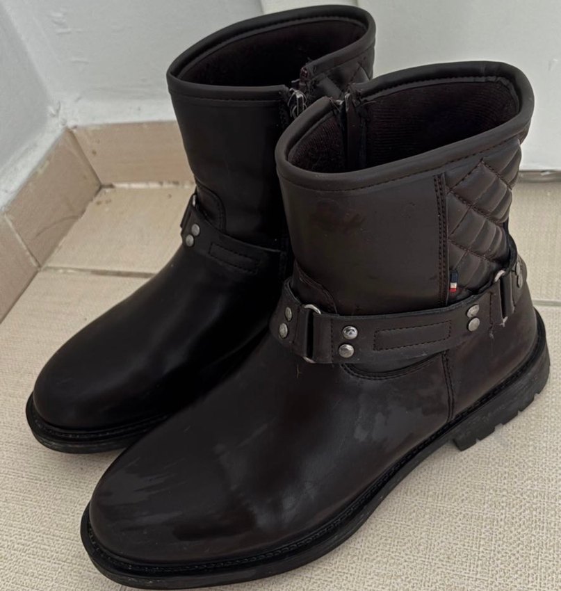 Koyu kahverengi deri biker botlar, blok topuklu ve tokalı detaylıdır. Desensiz bu botlar günlük kullanım için trend bir şıklık sunar.