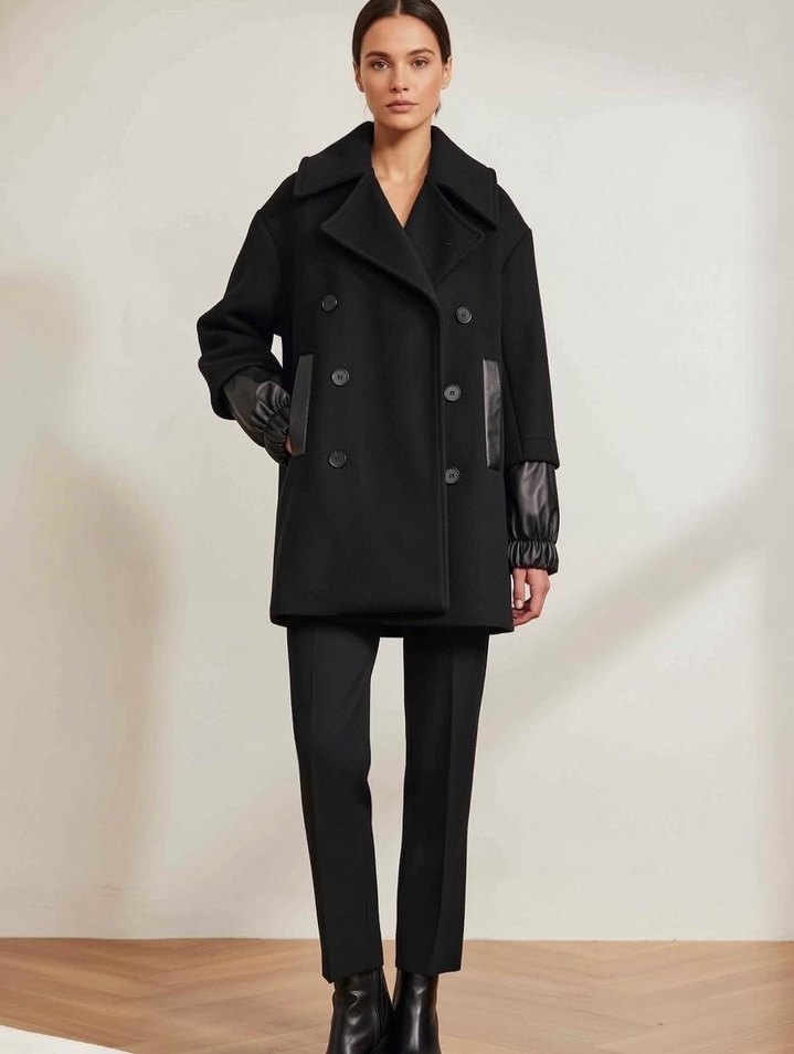 %100 yeni yündür kollardaki der detayi şahane bedeni S ama M giyebilir Siyah çift düğmeli kaban, geniş yakalar ve kollar ile ceplerde farklı dokulu detaylara sahiptir. Şık ve yapısal bir kesime sahiptir.