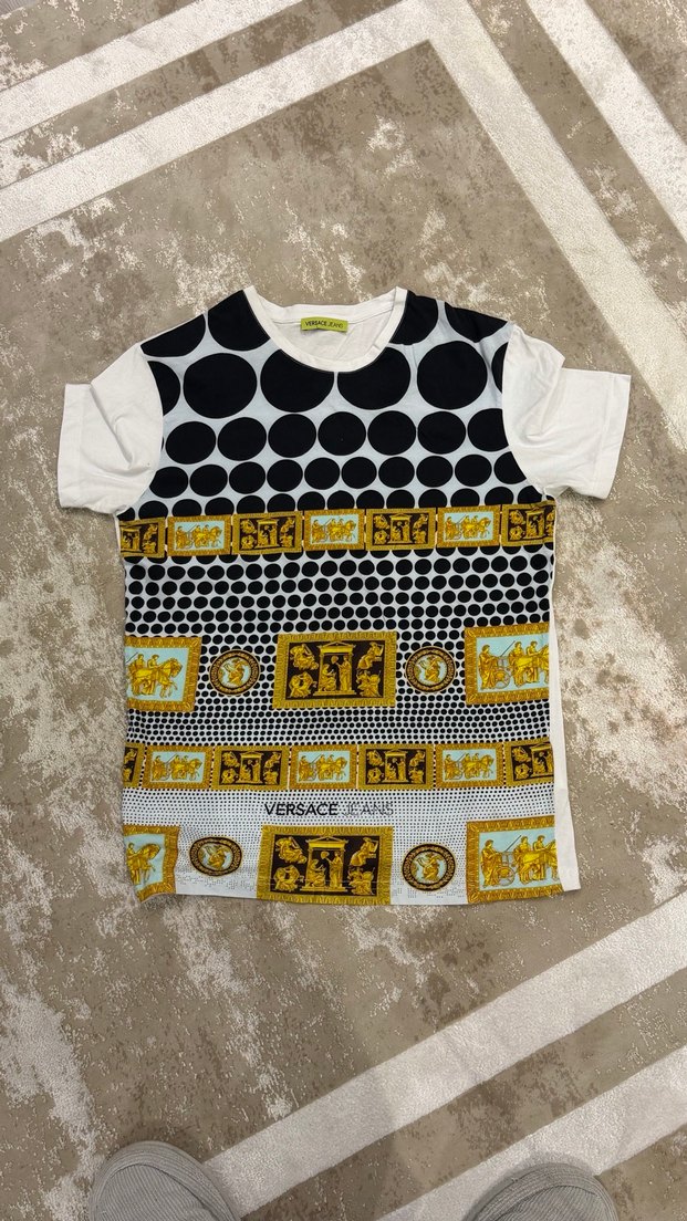 Beyaz Versace Jeans tişört, yuvarlak yaka ve kısa kolludur. Siyah ve altın baskılı desenlerle süslenmiş, bol kesimdir. Günlük rahat sokak stili için uygundur.