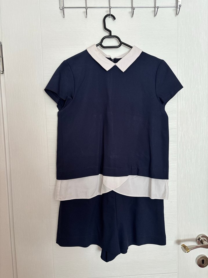 Elbise gibi duruyor ama şortlu olmasından sebep inanılmaz kullanışlı .Mavi renkte, kısa kollu ve yakalı mini elbise, beyaz yakası ve eteği ile sade ve şık bir ofis tarzı sunar.